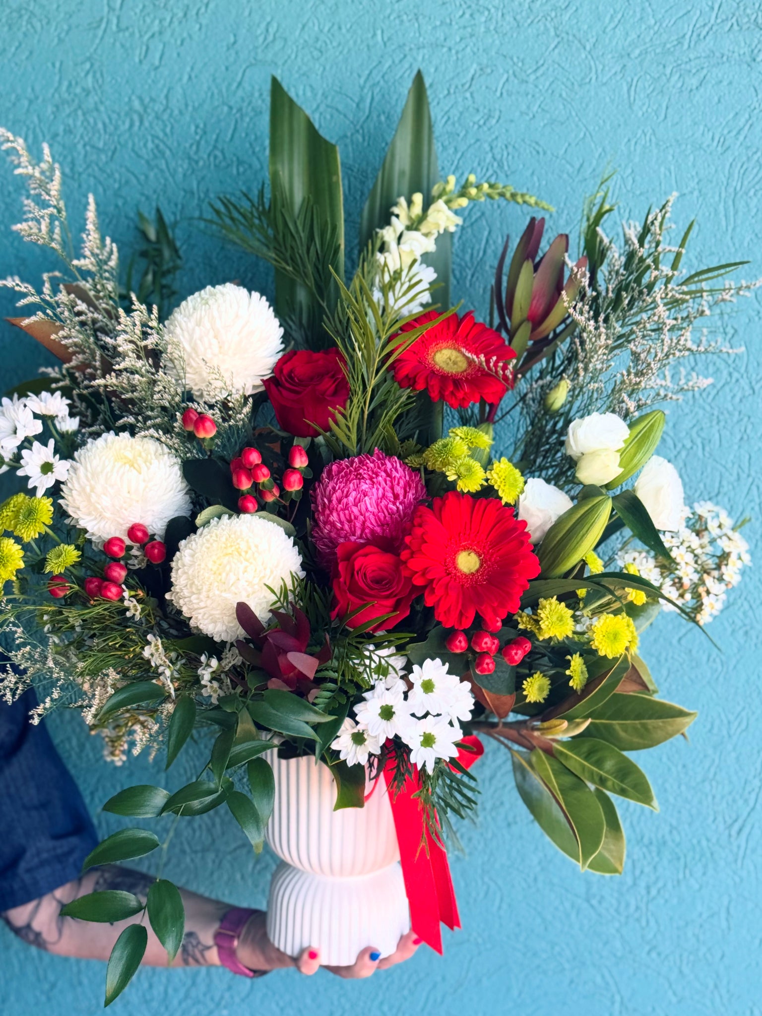 A gorgeous big and bold vase arrangement of Christmas coloured blooms, using in season flowers! Shes a stunner!