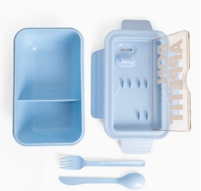 The light blue bon appétit lunch box combines functionality and style in one product. With dimensions of 20.2x7,2x12.2cm and a capacity of 1100 ml, it comes with a spoon, knife, and fork. Crafted from wheat straw plastic, it offers an eco-friendly option that provides durability and convenience for your daily meals.