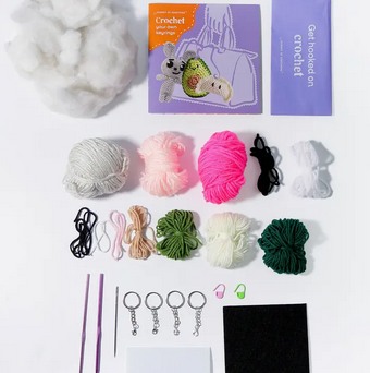 Create cuteness for your bag, keys, coin purse or anywhere you can hang something. This crochet kit includes everything you need and step by step instructions for a dumpling, avocado, teddybear and galah.